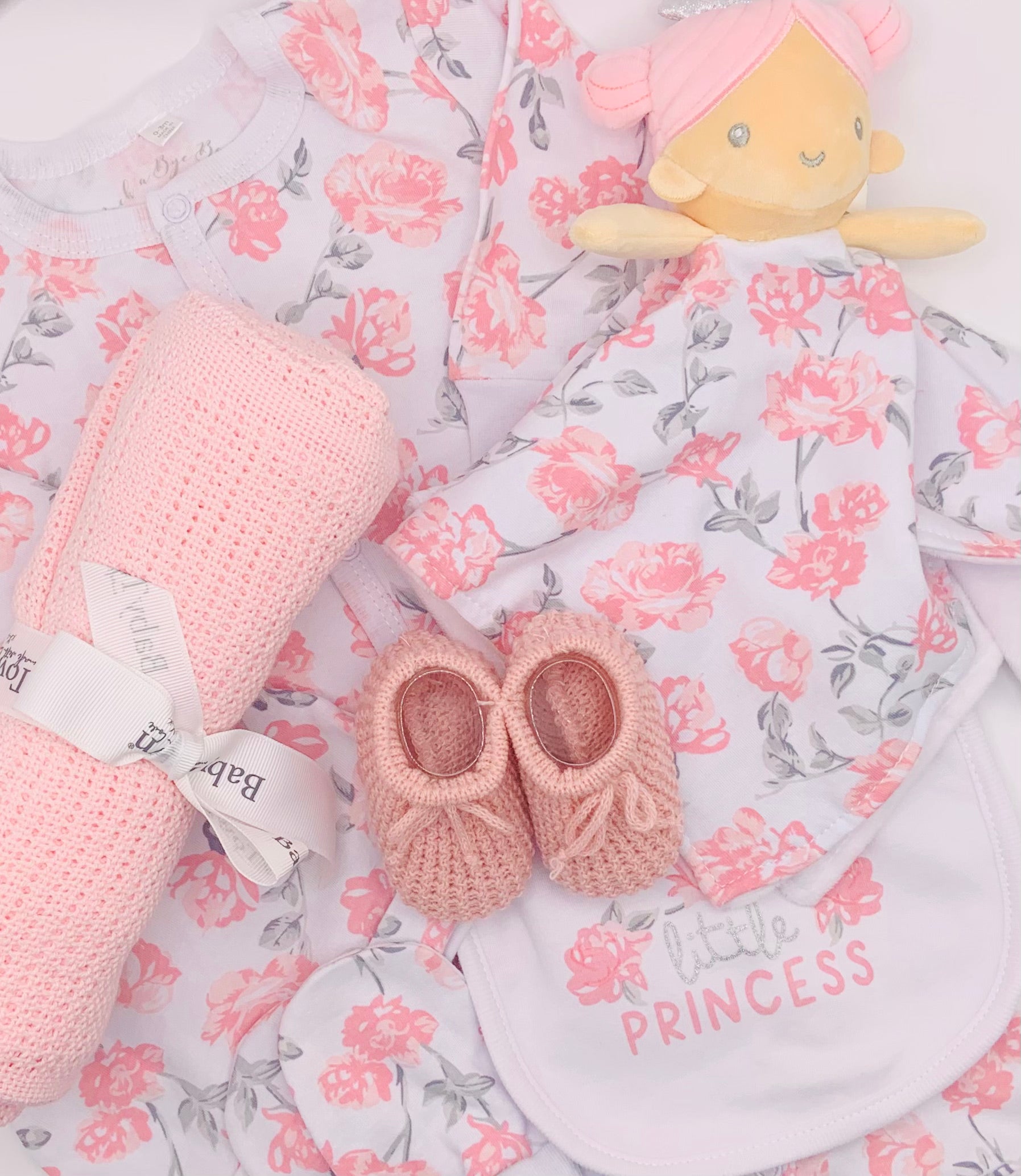 The set includes a charming floral long sleeve baby grow, perfectly complemented by a matching beanie and mittens. The beautiful floral bib featuring the words "little princess" adds an extra touch of sweetness and the pair of beautiful knitted tie up booties are guaranteed to look super cute on tiny feet! There is a matching princess doll comforter, a soft and cuddly companion perfect for naps, snuggles, and first adventures. Along with these, there’s a cozy cotton blanket ideal for all seasons.
